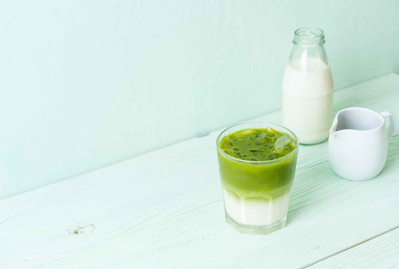 Pomiješajte smrznutu bananu, list špinata ili kelja, mjericu proteinskog praha i željeni napitak (kao što je bademovo mlijeko ili kokosova voda) s matcha prahom. Zatim u posudu u kojoj je smjesa dodajte narezane bademe, listiće kokosa, svježe bobičasto voće i chia sjemenke.