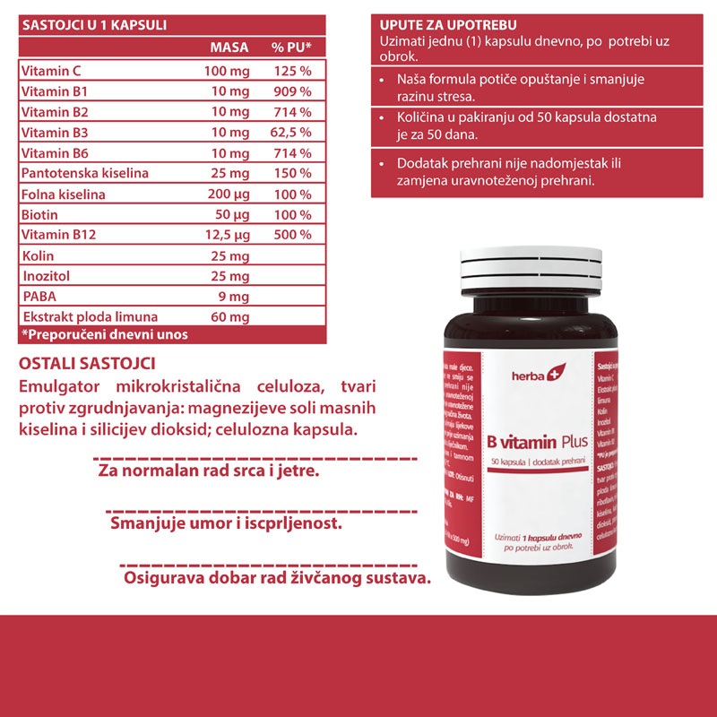 B VITAMIN PLUS sadrži sve vitamine B skupine uz dodatak vitamina C. Riječ je o esencijalnim vitaminima koji djeluju zajedno u svrhu stvaranja i oslobađanja energije. Pozitivno utječu na normalan rad krvožilnog, imunološkog i probavnog sustava. Održavaju zdravlje kože i kose.