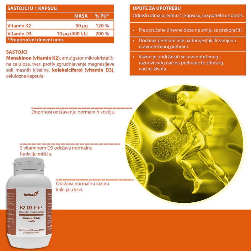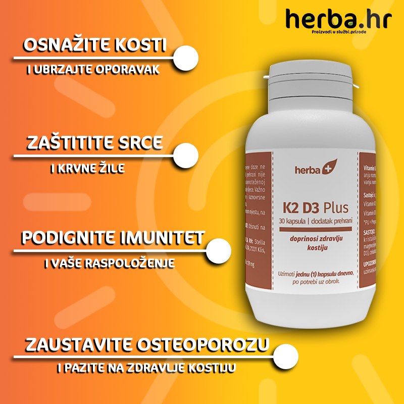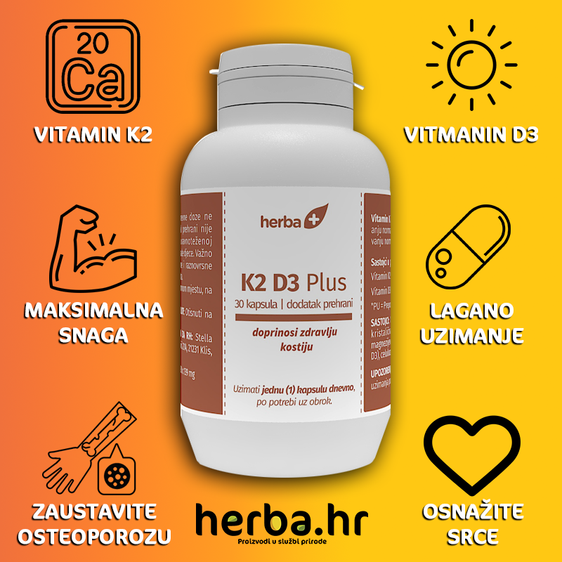 Ojačajte vaše kosti, zaštitite srce i krvne žile, ubrzajte oporavak prijeloma i ne dopustite osteoporozi da preuzme kontrolu nad vašim tijelom. Ostanite pokretni i zdravi koristeći K2 D3 Plus potpuno prirodne kapsule. Vaše tijelo će vam biti zahvalno.