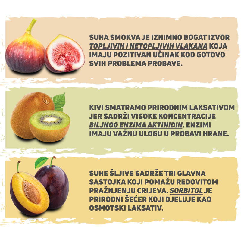 - ŠLJIVA: Sorbitol iz šljive prirodni je šećer koji djeluje kao osmotski laksativ. On zajedno s vlaknima apsorbira vodu i zadržava je u crijevima čineći stolicu mekom.