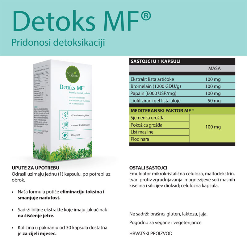 - DETOKS MF® sadrži ekstrakt lista artičoke koji na prirodan način pomaže u čišćenju organizma od nakupljenih toksina, pojačava zaštitnu moć jetre te regulira metabolizam šećera i masnoća. Detoksifikacija se temelji na čišćenju i njezi tijela iznutra prema van.